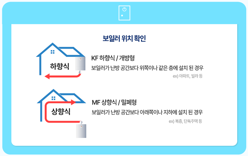 - 하향식 보일러 : 보일러 위치가 난방이 되는 바닥보다 위쪽이나 같은 층에 설치된 경우